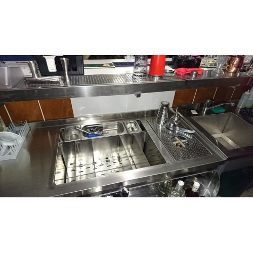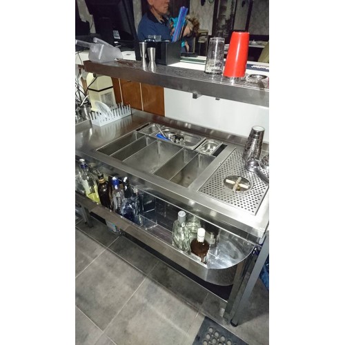 Барная станция полностью нержавейка , модифицирована ринзером и перфорацией вместо мойки , внизу полка , рельса закругленая не такая как у всех -без острых углов, размеры 1260х600х850