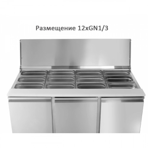 Такая конструкция сочетает в себе рабочий стол, холодильный шкаф и поверхность с гастроемкостями для полуфабрикатов или готовых продуктов.